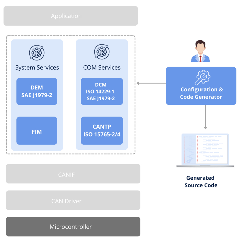 With a standalone configuration tool, OEMs can customize features to meet unique project needs. The stack works well in both AUTOSAR-based and non-AUTOSAR (conventional) ECU environments. It is even optimized to run on ECUs with limited memory.